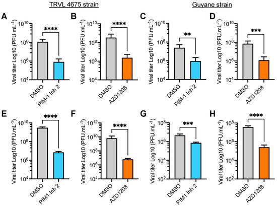 The preceding experiments were performed using MAYV strain AVR0565 isolated in San Martin, Peru (1995) [30]. To confirm the inhibitory activity of the PIM kinase inhibitors in other MAYV strains, we investigated the effects of these compounds on the replication of the TRVL 4675 strain (Mayaro county, Trinidad and Tobago, 1954) and the Guyane strain (French Guiana, 1996) [30]. Consequently, HeLa cells or HDFs were pre-treated with PIM kinase inhibitors or DMSO and infected as previously described. After 24 h of incubation, viral titers in cell supernatants were quantified using a plaque-forming assay. These analyses revealed that both PIM1 Inh 2 and AZD1208 significantly reduced MAYV viral titers when compared to DMSO-treated cells for both viral strains and both cell lines tested (Figure 2A–H). These results illustrate that PIM kinase inhibitors reduce MAYV replication regardless of the strain being tested.