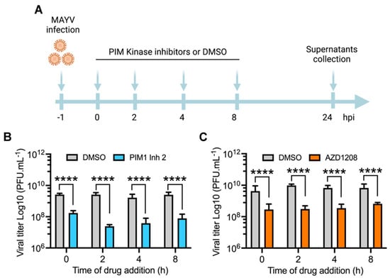 HeLa cells were infected with MAYV at an MOI of 10; after 1 h of virus adsorption (time 0 h post infection (hpi)), we added PIM kinase inhibitors or DMSO at 0, 2, 4 or 8 hpi. Then, we collected cell supernatants at 24 hpi and quantified the viral progeny production using a plaque-forming assay.