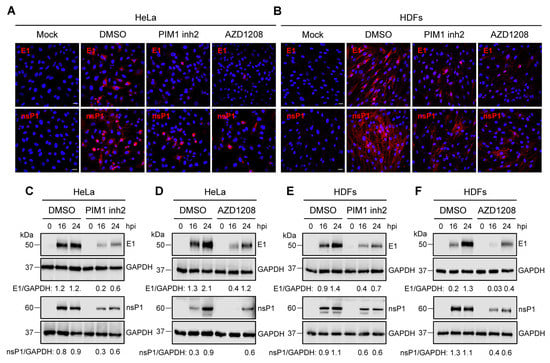 Our previous results suggested that PIM kinase inhibitors affect a crucial post-entry step in the MAYV replication cycle. Thus, we investigated the effect of these compounds on the expression of the viral proteins E1 and nsP1. First, we used an immunofluorescence confocal microscope to evaluate the presence of these viral proteins in HeLa cells or HDFs that were untreated or treated with the PIM kinase inhibitors or a control and incubated for 24 h upon viral infection. These analyses indicated that the PIM kinase inhibitor treatment resulted in an important decrease in both viral proteins in both HeLa cells and HDFs when compared to DMSO-treated cells. (Figure 4A,B). To further characterize the previous findings, we performed an infection kinetics experiment and evaluated the levels of viral proteins at different time intervals using Western blot. In these experiments, we detected a clear decline in the levels of both viral proteins in both cell lines treated with PIM kinase inhibitors (Figure 4C–F). These results indicate that the PIM kinase inhibitors considerably suppress the expression of E1 and nsP1 viral proteins.