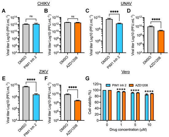 Studies evaluating PIM kinase inhibition as an antiviral strategy are limited. However, it has been reported that inhibiting the PIM kinase family affects the replication of HRV-16, HCV and SVCV [27,28,29]. To explore whether the PIM kinase inhibitors are able to affect the replication of other emerging or re-emerging arboviruses, we tested the effect of these compounds on the alphaviruses Chikungunya (CHIKV) and Una (UNAV) and the Flavivirus Zika (ZIKV). We pretreated Vero cells with PIM1 Inh2, AZD1208 or DMSO and then infected the cells with CHIKV, UNAV or ZIKV; after 24 h of incubation, viral titers in cells’ supernatants were evaluated using a plaque assay. As shown in Figure 5, both compounds reduced UNAV and ZIKV replication, whereas with CHIKV, the PIM kinase inhibitors did not display any effect (Figure 5A–F). The observed antiviral effect of the PIM kinase inhibitors on UNAV or ZIKV did not appear to be associated with cell toxicity (Figure 5G). These findings reveal that PIM kinase inhibitors also exhibit blocking activity against UNAV and ZIKV, suggesting that these kinases could represent a potentially broad host antiviral target.