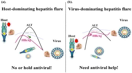 The quantitative HBsAg (qHBsAg) has been considered as a surrogate marker of transcriptionally active cccDNA or a marker of HBV-infected hepatocytes, and sensitive and reproducible qHBsAg assays have been available commercially and used widely in clinical practice and research []. Along with HBV DNA levels, serum HBsAg levels also upsurge prior to ALT elevation to its peak but may start to decline successively prior to the peak of ascending ALT in some hepatitis flares, which may resolve spontaneously []. Hepatitis flares with such a profile of combined HBsAg/ALT kinetics may reflect that the host immune response is dominating over the virus and the effective immune clearance of HBV is ongoing (host-dominating flare; HDF) (Figure 1a). In contrast, flares with qHBsAg increasing along with ascending ALT or remaining high after the peak of ALT may reflect that the virus is dominating over the host and the immune response is failing or being ineffective (virus-dominating flare; VDF) (Figure 1b) []. A proof-of-concept case study has shown that retreatment may be unnecessary or can be held in a patient with HDF, whereas timely retreatment was required for a patient with VDF []. This has been further confirmed by another study involving 48 patients who remained un-retreated, of whom five patients with off-NUC hepatitis flare have demonstrated off-NUC qHBsAg kinetics from EOT to HBsAg loss []. Furthermore, a retrospective appraisal study conducted by us using pre-retreatment combined HBsAg/ALT kinetics in 22 patients with off-NUC severe ALT flare (ALT > 30 × ULN), showing much greater and faster HBsAg decline (>1–3 log10 IU/mL decline in 12 months) during NUC retreatment in patients with VDF (bad flare but good response to NUC therapy), in contrast to minimal HBsAg decline or even HBsAg increase or rebound in patients with HDF (good flare but bad response to NUC therapy) []. An extension study using retrospective appraisal in 220 patients with off-NUC flare has further demonstrated that retreatment in patients with VDF achieved 1-year HBsAg decline of −0.91 log10 IU/mL in contrast to a decline of −0.07 log10 IU/mL in patients with HDF, while un-retreated patients with HDF showed greater HBsAg decline and a three-year HBsAg loss rate >20% (Jeng and Liaw, 2021, unpublished data). It is conceivable that patients with off-NUC VDF do need timely NUC retreatment to prevent severe ALT flare and help their ineffective immune response to fight the virus. In contrast, patients with off-NUC HDF which may overcome HBV and lead to further HBsAg decline and NUC retreatment should be withheld because it may halt or interrupt the strong endogenous immune clearance response of host. [].