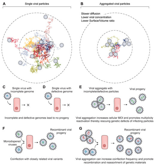 Schematic showing how viral aggregation affects their ability to infect target cells and their evolution. (A) A hypothetical arrangement of monodispersed viral particles (N = 9 viral particles) has a relatively faster diffusion, which increases their dissemination and the frequency of adsorption to target cells. (B) Aggregated viral particles (N = 3 trimers = 9 viral particles) diffuse more slowly and lead to a lower effective titer, which decreases their association rate with target cells before being deactivated or degraded. (C,D) In the case of multi-segmented and multipartite viruses, a single virus particle is likely to fail in producing progeny due to several challenges, the most prominent being defective or incomplete genomes. Following virus entry, the viral genome is released inside the host cell to start viral replication. However, the genome is highly likely to be incomplete or defective, particularly with RNA viruses such as influenza. This results in the failure of the virion to transcribe or translate necessary viral factors to produce infectious progeny. (E) Invasion of host cells by viral particles in an aggregated state is conducive to increasing cellular MOI, which releases multiple copies of the viral genome inside the host cell. This sets the stage for genetic complementation and multiplicity reactivation, which facilitates the overcoming of any genetic defect or missing genetic factors. It increases the chances of the virions to replicate and produce viral progeny that will start their infection cycle. (F,G) Genetic recombination and reassortment between closely related virions in either the monodispersed state (F) or the aggregated state (G) can produce chimeric progeny with genetic segments derived from each parent. This influences their fitness and contributes to genetic diversity.