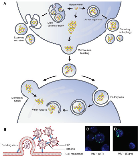 In the canonical route of virus release, enveloped viruses leave the infected cell by budding and secretion [93]. Non-enveloped viruses typically lyse the host cells to exit them. However, some of them escape via secretory pathways. They can bud into intracellular multivesicular bodies (MVB) and leave after fusing with the plasma membrane. Some follow the non-canonical route, subverting cellular autophagy and releasing by secretory mechanisms.