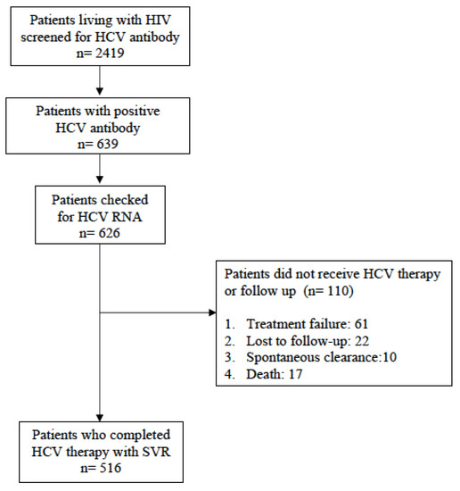 Systemic screening for the HCV antibody was performed annually in all HIV-positive patients between 1 June 2009 and 31 December 2019. The HCV RNA was tested for in-patients who were positive for the HCV antibody, and treatment consisted of peginterferon alfa plus ribavirin (PegIFN/RBV), or DAAs with or without ribavirin. The HCV RNA was tested at the baseline before HCV therapy, at the end of treatment, at follow-up week 12 or 24, and then at least once annually. A sustained virological response (SVR) was defined as one negative HCV RNA test 12 or 24 weeks after the end of treatment (depending on the treatment regimen). Patients were tested for the presence of HCV RNA every year at their physician’s discretion, with additional testing if HCV reinfection was suspected.