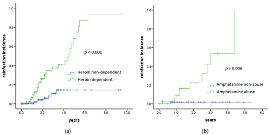 Figure 2 shows the trends of HCV reinfection in the subgroups of PWID with or without heroin dependency and MSM with or without amphetamine abuse using Kaplan–Meier curves.