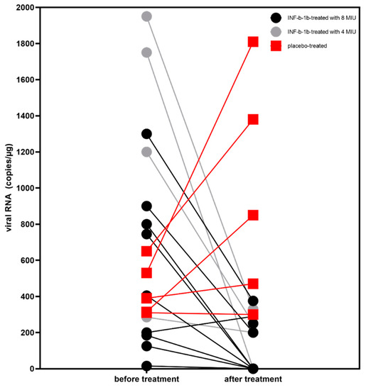 Changes in parvovirus B19 (B19V) viral RNA following 6 months IFN-ß treatment (determined as copies/μg). Patients received placebo are shown in red. B19V viral RNA was significantly reduced in IFN-ß treated patients from baseline to follow-up (p = 0.001). No significant difference was seen at baseline between INF-b treated and placebo patients (p = 0.3). In contrast, at follow-up IFN-ß treated and placebo patients differ significantly (p = 0.0005). Nonparametric Wilcoxon-Mann-Whitney-Test was used to compare the results at the two time points (before vs. after treatment) and between the groups. B19V: parvovirus B19; IFN-ß: interferon beta-1b; RNA: ribonucleic acid.