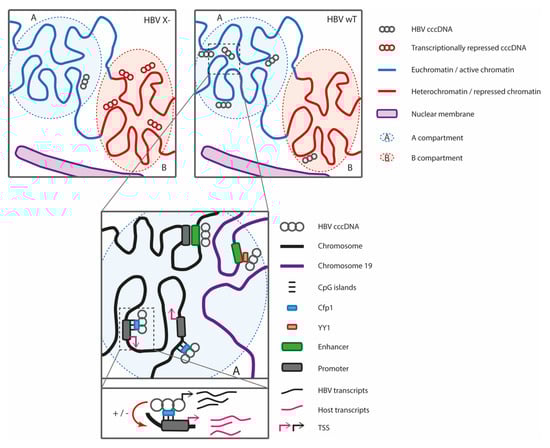 - Hensel, K.O.; Cantner, F.; Bangert, F.; Wirth, S.; Postberg, J. Episomal HBV persistence within transcribed host nuclear chromatin compartments involves HBx. Epigenetics Chromatin 2018, 11, 34. [Google Scholar] [CrossRef] [PubMed]