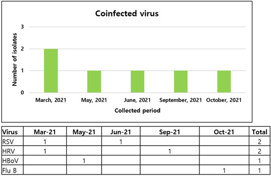 - Kim, Y.G.; Park, H.; Kim, S.Y.; Hong, K.H.; Kim, M.J.; Lee, J.S.; Park, S.S.; Seong, M.W. Rates of Coinfection Between SARS-CoV-2 and Other Respiratory Viruses in Korea. Ann. Lab. Med. 2022, 42, 110–112. [Google Scholar] [CrossRef]