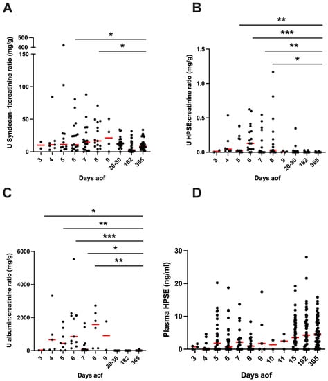 Heparanase and syndecan–1 levels during PUUV–HFRS. (A) Urinary syndecan–1:creatinine ratio (B), HPSE:creatinine ratio and (C) albumin:creatinine ratio. (D) HPSE concentration in plasma. Concentrations were measured from sequential samples of 49 (55 for plasma) patients hospitalized due to PUUV–HFRS (with a total of 159 urine and 262 plasma samples). Days after onset of fever (aof) 3–9 represent the acute stage, 20–30 the convalescent and 182–365 the controls. Differences between individual time points and the last time point (365 aof), which was considered to represent full recovery and used as controls, were assessed by GEE and significant differences indicated as *** <0.001, ** <0.01 and * < 0.05. Red lines represent mean ± standard deviation.