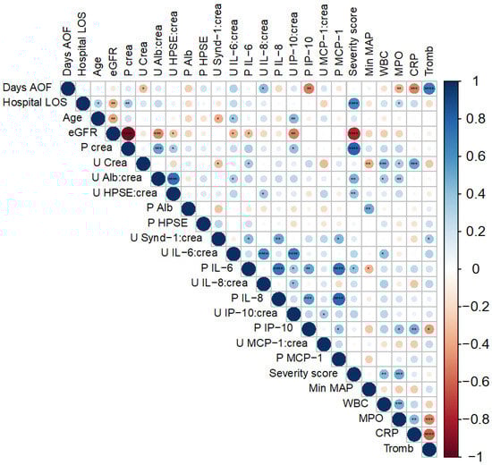 Spearman’s rank correlation coefficient matrix. The colors of the round circles indicate the level of the correlation coefficient and increasing size with a lower p–value. Statistical significance is specified as * = p < 0.05, **= p < 0.01, ***= p < 0.001, ****= p < 0.0001. AOF = after onset of fever, LOS = length of stay, eGFR = estimated glomerular filtration rate, P = plasma, U = urine, crea = creatinine, alb = albumin, HPSE = heparanase, Synd–1 = syndecan–1, IL = interleukin, IP–10 = interferon gamma–induced protein 10, MCP–1 = monocyte chemoattractant protein 1, min MAP = minimum mean arterial pressure, WBC = white blood cells, MPO = plasma myeloperoxidase, CRP = plasma C–reactive protein, tromb = blood thrombocytes.