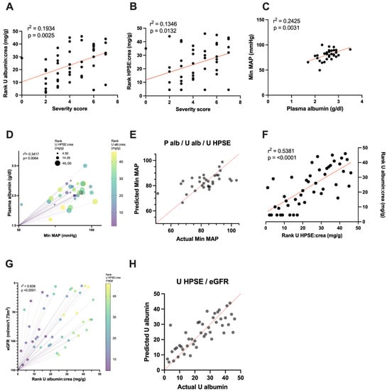 Simple and multiple linear regression models. Simple linear regression models of rank–transformed urinary albumin:creatinine ratio (A) and rank–transformed urinary HPSE:creatinine ratio (B) with severity score. (C) Simple linear regression model of plasma albumin and MAP. (D) Multiple linear regression model of plasma albumin, rank–transformed urinary HPSE:creatinine ratio and rank–transformed albumin on MAP. (E) Predicted vs. actual MAP of multiple linear regression model in (D). (F) Simple linear regression model of rank–transformed urinary HPSE:creatinine ratio and albumin:creatinine ratio. (G) Multiple linear regression model of eGFR and urinary HPSE on albuminuria. (H) Predicted vs. actual data of the multiple regression model in (G).