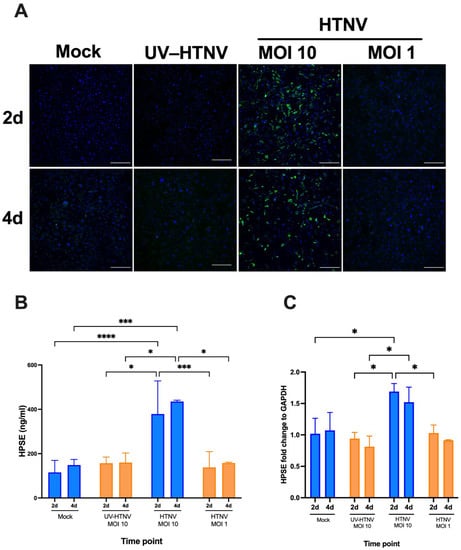 Orthohantaviruses have been shown to infect podocytes [17,18], which have been postulated as major contributors of HPSE during kidney diseases (e.g., diabetic nephropathy) [43,44]. To assess the ability of orthohantavirus infection to induce HPSE upregulation in podocytes, we infected conditionally immortalized and differentiated human podocytes with various amounts (high and low dose; MOI 10 and 1, respectively) of Hantaan orthohantavirus (HTNV). We analyzed virus infectivity and HPSE expression by comparing HTNV–infected cells with UV–inactivated HTNV (MOI 10) or mock–infected cells at 2 and 4 dpi (Figure 4). As judged by viral nucleocapsid N–specific intracellular immunofluorescence, we observed efficient infection only in cells infected with a high dose of HTNV (Figure 4A, ~70% of infected cells at both 2 and 4 dpi). Interestingly, in line with infection efficiency, we observed a significant increase in HPSE expression in podocyte supernatants infected with a higher viral dose, but not in those infected with a lower dose or UV–inactivated HTNV (Figure 4B). Consistently, we observed mildly but significantly increased expression of HPSE mRNA only in cells infected with high–dose HTNV (Figure 4C, ~1.5–fold over mock–infected cells), indicating that the increase in HPSE levels is most likely due to increased transcriptional activity.