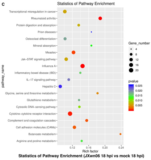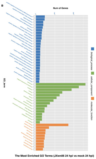 Gene Ontology (GO) terms and KEGG pathway enrichment of the DEGs. (A,B) The most significant enriched GO terms (top 50) among the DEGs in the JXwn06 inoculation group at 18 hpi vs. mock 18 hpi (A) and JXwn06 inoculation group at 24 hpi vs. mock 24 hpi (B). (C,D) The most significant enriched KEGG pathways among the DEGs in the JXwn06 inoculation group at 18 hpi vs. mock 18 hpi (C) and JXwn06 inoculation group at 24 hpi vs. mock 24 hpi (D).