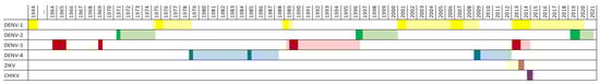 Circulation of the four dengue virus serotypes, Zika virus and chikungunya virus in French Polynesia, 1944–2021. DENV: dengue virus; ZIKV: Zika virus; CHIKV: chikungunya virus. Epidemic and inter-epidemic periods are indicated by bright and pale colors, respectively.