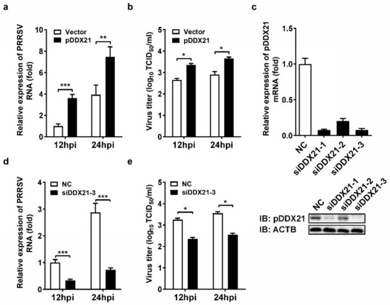 iPAM cells were transfected with siDDX21-3 or negative control siRNA (NC) for 24 h and then infected with PRRSV (MOI = 0.1). At 12 and 24 hpi, the cells were collected for qRT-PCR and TCID50 assays. The results show that cells with a knockdown of DDX21 had significantly lower numbers of copies of viral genomic RNA (Figure 1d) and viral titers (Figure 1e) compared with the NC group cells, further demonstrating that pDDX21 positively regulates PRRSV replication in iPAM cells.
