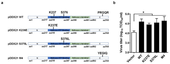 Previous studies reported that DDX21 possesses ATPase activity, RNA helicase activity, and RNA-folding enzyme activity [38,39,40]. To investigate whether the promotion of PRRSV proliferation by pDDX21 depends upon its enzyme activity, we constructed three helicase-dead mutants of pDDX21: pDDX21-K237E (lacking ATPase activity), pDDX21-S376L (lacking RNA helicases activity), and pDDX21-M4 (lacking RNA foldase activity) (Figure 2a). iPAM cells were transfected with expression plasmids encoding wildtype (WT) pDDX21 or its mutants (K237E, S376L, M4) for 30 h and then infected with PRRSV (MOI = 0.1). At 24 hpi, the cells were collected for use in a TCID50 assay. The results show that the overexpression of pDDX21 mutants K237E, S376L, and M4 each significantly elevated the viral titers to a similar degree as did the overexpression of WT pDDX21, demonstrating that pDDX21 facilitates PRRSV proliferation independently of its ATPase, RNA helicase, and folding enzyme activities (Figure 2b).