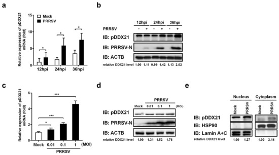 PRRSV infection promotes pDDX21 translocation from the nucleus to the cytoplasm. (a,b) iPAM cells were infected with PRRSV (MOI = 1). At 12, 24, and 36 hpi, these cells were collected for use in qRT-PCR to determine the number of mRNA copies of pDDX21 (a) or in Western blotting with antibodies against DDX21, PRRSV N protein, and β-actin (b). (c,d) iPAM cells were infected with increasing doses of PRRSV (0.01 MOI, 0.1 MOI, or 1.0 MOI). At 24 hpi, these cells were collected for use in qRT-PCR (c) and Western blotting (d) as described in (a,b), respectively. (e) iPAM cells were grown until they formed a monolayer on 100-mm plates and then infected with PRRSV (MOI = 0.1). These cells were collected at 24 hpi, and a nuclear cytosol fractionation assay was performed to detect the pDDX21 expression in the nucleus or cytoplasm. Data are presented as the means ± SD of three independent experiments (* p < 0.05; *** p < 0.001). The relative levels of pDDX21 in PRRSV-infected cells as compared with in mock-infected cells were analyzed by ImageJ software, and the ratio is displayed below the images as the fold change.