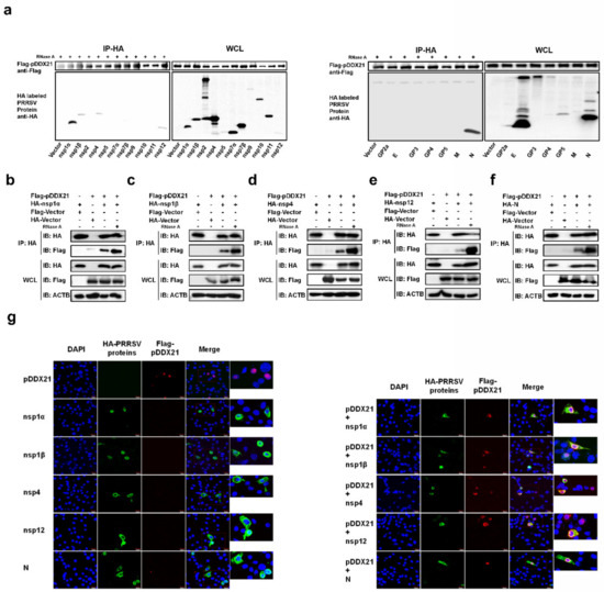 Because pDDX21 was found to promote PRRSV replication and PRRSV infection was also found to enhance pDDX21 expression, it was reasonable to speculate that pDDX21 may achieve this sequence of events through a mechanism of interaction with PRRSV viral protein(s). To confirm this speculation, HEK-293T cells were co-transfected with pCAGGS-Flag-pDDX21 and HA-tagged expression plasmids encoding individual PRRSV proteins, then subjected to a Co-IP assay. Previous studies have demonstrated that DDX21 can bind RNA [42]; thus, to exclude the non-specific interaction mediated by RNA, the cell lysates were treated with RNase A prior to their use in a Co-IP. The results show that pDDX21 interacted with nsp1α, nsp1β, nsp4, nsp12, and N protein (Figure 4a). To further confirm the interactions between pDDX21 and these viral proteins, a reverse Co-IP experiment was also performed. As shown in Figure 4b−f, HA-nsp1α, HA-nsp1β, HA-nsp4, HA-nsp12, and HA-N protein could be efficiently co-immunoprecipitated with Flag-pDDX21 by using an anti-HA antibody.