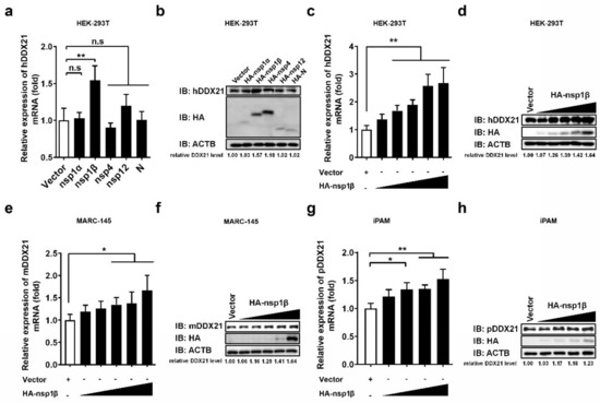 Because PRRSV infection was found to promote DDX21 expression (Figure 3a–d), and DDX21 was found to interact with PRRSV-encoded nsp1α, 1β, nsp4, nsp12, and N protein (Figure 4a–f), we further investigated whether these DDX21-interacting viral proteins also regulate DDX21 expression. To this end, HEK-293T cells were transfected with plasmids expressing HA-tagged nsp1α, nsp1β, nsp4, nsp12, or N protein, and then subjected to qRT-PCR and Western blot to detect the mRNA and protein expressions, respectively, of DDX21. Among the tested viral proteins, only nsp1β significantly upregulated the DDX21 expression (both mRNA and protein levels; Figure 5a,b, respectively). To further confirm, the upregulation effect of nsp1β on DDX21, HEK-293T cells, MARC-145 cells, and iPAM cells were respectively transfected with increasing doses of nsp1β expression plasmid. The results show that, with increasing nsp1β expression levels, the mRNA and protein levels of DDX21 were significantly upregulated in a dose-dependent manner in all tested cell lines (Figure 5c–h).