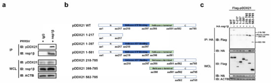 nsp1β interacts with the C-terminal of pDDX21 (a) iPAM cells were infected with PRRSV (MOI = 0.5). At 36 hpi, these cells were lysed and immunoprecipitated with anti-nsp1β or anti-IgG monoclonal antibodies. WCL and IP complexes were analyzed by immunoblotting with anti-DDX21, anti-nsp1β, and anti-β-actin antibodies; (b) Schematic representation of WT pDDX21 and its truncation mutants. (c) HEK-293T cells were co-transfected with expression plasmids of Flag-tagged pDDX21-WT (3 μg) or its truncation mutants (3 μg) and HA-tagged nsp1β (3 μg). At 30 h post-transfection, these cells were lysed and immunoprecipitated with an anti-HA monoclonal antibody. WCL and IP complexes were analyzed by immunoblotting with anti-Flag, anti-HA, or anti-β-actin antibodies.
