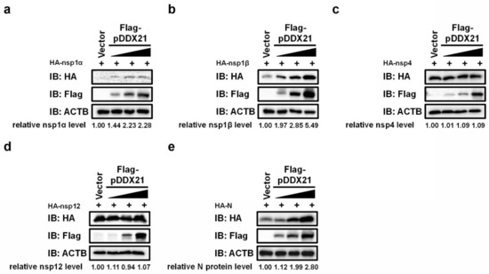 To further explore the biological significance of the interaction between pDDX21 and PRRSV-encoded proteins, we examined the effects of pDDX21 on the expressions of nsp1α, nsp1β, nsp4, nsp12, and N protein. iPAM cells were co-transfected with different doses of pCAGGS-Flag-pDDX21 and expression plasmids encoding HA-tagged nsp1α, nsp1β, nsp4, nsp12, or N protein. Cells were harvested at 30 h post-transfection and analyzed by Western blotting. Among the five tested PRRSV proteins, nsp1α, nsp1β, and N protein had expression levels that were significantly upregulated by pDDX21 (Figure 7a,b,e), whereas the expression levels of nsp4 and nsp12 were not significantly altered by pDDX21 (Figure 7c,d).