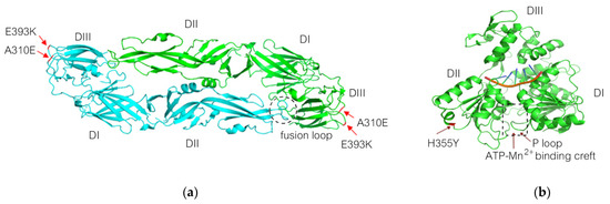 (a) Two E mutations, A310E and E393K of ZIKV-PDK7-S3 and ZIKV-PDK7-S1.4, are mapped on the ZIKV E protein dimer using PBD: 5LBV as a template. Both mutations are located at domain III (DIII) of the E protein as red indicates. (b) NS3 mutation H355Y of ZIKV-PDK7-S3 and ZIKV-PDK7-S1.4 is mapped onto the ZIKV NS3 protein using PBD: 5GJB as a template. The mutation is located at domain II (DII) of the helicase–RNA complex. The dotted square presents an ATP/Mn2+ binding site in a cleft of domain I and II (DI and DII), which is composed of residues G197, K200, T201, R202 (P loop), E286, N330, R459, and R462.