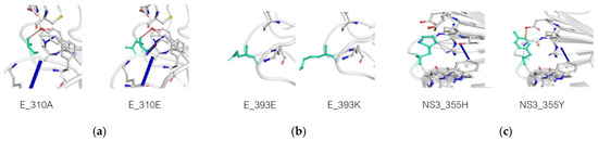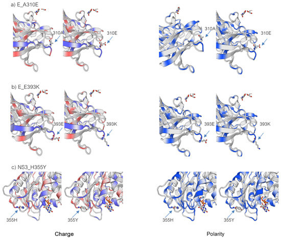 Effects of mutations on polarity and charge of protein in the mutation region. SWISS-MODEL was used to model and visualize the changes in charge (left) and polarity (right) in the mutation residues of E:DIII and NS3:DII, using PBD: 5LBV and PBD: 5GJB, respectively. The A310E mutation on E:DIII (a) shows a change from an uncharged, nonpolar residue to a negatively charged, polar residue, while the E393K mutation (b) goes from a negatively charged, polar residue to a positively charged polar residue. The H355Y mutation on NS3 (c) shows a change from a positively charged, polar residue at pH 7.2 to an uncharged, polar residue.