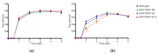 Growth kinetics of wild-type and ZIKV variants. Viral growth kinetics were determined in C6/36 (a) and Vero (b) cells. The cells were infected with ZIKVs; wild-type (circle), ZIKV-PDK7-B5 (triangle), ZIKV-PDK7-S3 (inverted triangle), and ZIKV-PDK7-S1.4 (square) at an MOI of 0.01. The experiment was performed in triplicate with duplicate plaque counting. The mean viral titers at each time-point were plotted with the error bar representing the standard deviation (SD). Two-way ANOVA was used to statistically analyze the data against the wild-type strain. Asterisks (*) indicate a statistically significant difference (p < 0.05). If not displayed, the data did not show significant differences.