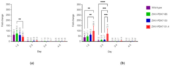 The replication efficiency of various ZIKV isolates was determined in vitro by growth kinetics assay on Vero and C6/36 cells as mammalian host and vector models, respectively. While there is a slight difference in the viral production of ZIKV variants in C6/36 cells throughout the 5 dpi (Figure 5a), in Vero cells, small-plaque variants, especially ZIKV-PDK7-S1.4, had significantly reduced viral yields by approximately two log10 at early dpi compared to the wild-type and the big-plaque variant ZIKV-PDK7-B5 (Figure 5b). However, at three dpi, the viral titer of the ZIKV-PDK7-S1.4 isolate accelerated to titers comparable to other strains, which could correspond to an enhanced replication rate per day of the ZIKV-PDK7-S1.4 isolate. Fold-change per day of the viral titer was calculated for all days. On 1 dpi, virus titers were 8.3 × 105 pfu/mL for the wild-type, 6.1 × 105 pfu/mL for ZIKV-PDK7-B5, and 6.8 × 102 pfu/mL for ZIKV-PDK7-S1.4. However, between days 1 and 2 dpi, ZIKV-PDK7-S1.4 titer increased 99-fold, while wild-type and ZIKV-PDK7-B5 titers increased only 39-fold and 47-fold, respectively. Similarly, between days 2 and 3 dpi, ZIKV-PDK7-S1.4 titer increased 72-fold, while wild-type and ZIKV-PDK7-B5 titers increased only 6-fold and 13-fold, respectively (Figure 6b). Notably, the ZIKV-PDK7-S3 virus may not be a homogeneous isolate suggested by the sequence variation shown in the chromatography (Supplementary Figure S1). This could be why the viral growth kinetics (Figure 5b) is similar to the parent strain.