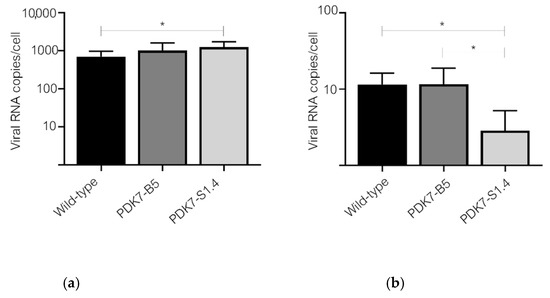 Viral entry into C6/36 (a) and Vero (b) cells was determined by real-time PCR. The viral RNA copies number per cell was determined by real-time PCR. The cells were infected with ZIKVs, wild-type, ZIKV-PDK7-B5, and ZIKV-PDK7-S1.4, at an MOI of 10. After viral adsorption, the viruses were removed and treated with acid glycine to inactivate the remaining un-internalized viruses. After 24 h post-infection, the infected cells were harvested for RNA extraction and subjected to one-step real-time PCR. The experiment was performed in triplicate with triplicate real-time PCR quantification. The bar graph represents mean values, with the error bar representing SD. One-way ANOVA was used, and asterisks (*) indicate a statistically significant difference (p < 0.05).