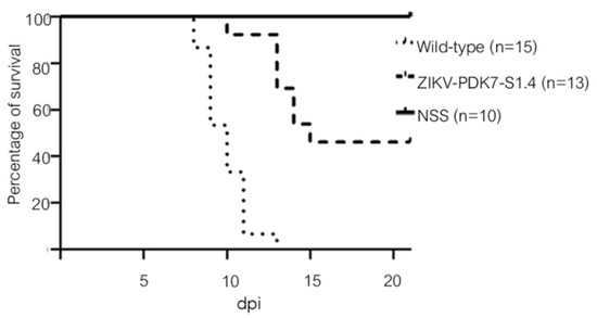 Pregnant ICR (Institute of Cancer Research) mice, a strain of albino mice originating from a Swiss mouse colony, were obtained from Nomura Siam International (Thailand). Two-day-old ICR mice were intracranially injected (i.c.) with 2 × 104 pfu/mouse of normal saline (NSS) (n = 10), ZIKV-CVD_06-020 (n = 15), or ZIKV-PDK7-S1.4 (n = 13). The injected mice were observed for 21 days to determine morbidity and mortality. The survival curve was constructed and analyzed using Log-rank (Mantel-Cox) tests from GraphPad Prism version 9.0.2 (GraphPad Software, San Diego, CA, USA). A significant difference is achieved at a p-value ≤ 0.0001.