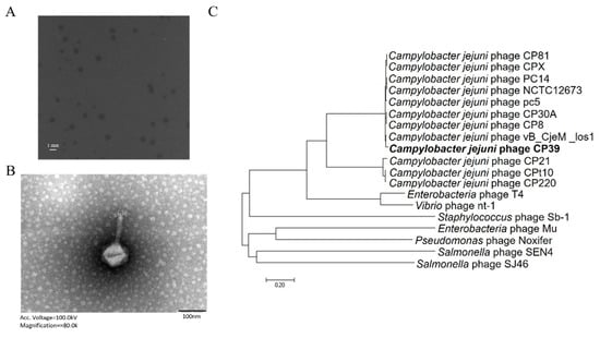 Identification and characterization of Campylobacter jejuni phage CP39. (A) The plaque morphology of C. jejuni phage CP39. (B) transmission electron microscopy (TEM) image of phage CP39 indicating the phage belongs to Myoviridae family. (C) The phylogenetic relationship of phage CP39. Additional information of genomes was listed in Table S2.