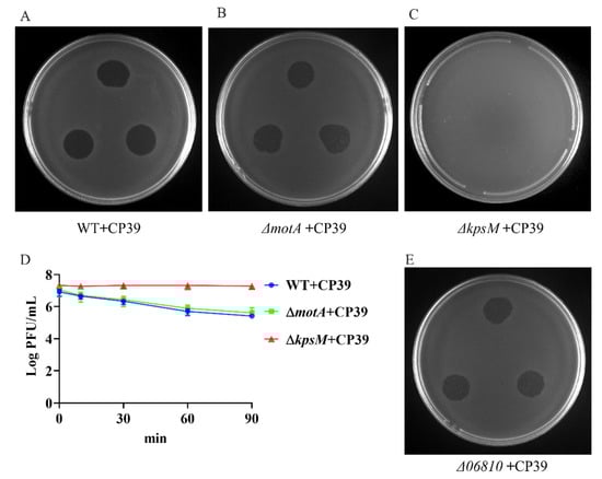 Identification of phage CP39 receptor type. (A) Sensitivity of NCTC12662 strain to CP39. (B) Sensitivity of motA mutant strain to CP39. (C) Sensitivity of kpsM mutant strain to CP39. (D) The adsorption assay of CP39 to NCTC12662, motA and kpsM mutant strain. motA and kpsM mutant strains were infected with CP39 for 100 min at an MOI of 0.01. The same culture NCTC12662 served as the control. (E) Sensitivity of Δ06810 mutant to CP39.