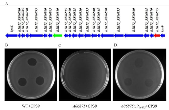 3.3. The 06875 Gene Located in CPS Cluster of NCTC12662 Is Responsible for the Phage CP39 Infection