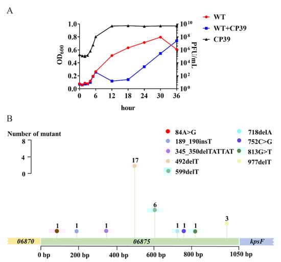The occurrence of phage resistance in C. jejuni NCTC12662 and the mutation frequency of the 06875 gene during CP39 infection. (A) Generation of phage lysis curves and phage-resistant bacterial outgrowth. NCTC12662 was infected with CP39 for 36 h at an MOI of 0.01. NCTC12662 without phage was served as the wild type (WT) control. The one-step growth curve of phage CP39 was evaluated by the PFU/mL at each time point. (B) The mutation frequency of the 06875 gene. The mutation frequency was calculated as the number of 06875 mutant from 100 phage-resistant colonies by PCR sequencing. A “>” represented the original base pair was replaced by another base pair; A “_” represented an insertion (ins) or deletion (del) was occurred between base pairs.