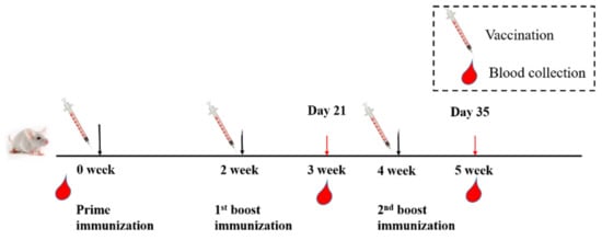 Enzyme-linked immunosorbent assay (ELISA) was used to quantify the SARS-CoV-2 RBD-specific IgG, IgG1 and IgG2a titers in serum based on a previous report [], with minor modification. Briefly, ELISA plates were pre-coated with 2 µg/mL RBD of wildtype SARS-CoV-2 overnight at 4 °C. The coated plates were washed with phosphate-buffered saline (PBS) containing 0.05% Tween (PBS-T) and blocked with PBS containing 2.5% bovine serum albumin for 2 h at 37 °C. Mouse sera were serially diluted in PBS-T, followed by incubation of plates at 37 °C for 1 h. After four washes with PBS-T, HRP-conjugated goat anti-mouse IgG (Beyotime, Shanghai, China), goat anti-mouse IgG1 (abcam, Shanghai, China) or goat anti-mouse IgG2a (abcam, Shanghai, China) was applied to plates and incubated at 37 °C for 1 h. After the plates were washed thoroughly, 3, 3′, 5, 5′-Tetramethylbenzidine (TMB) (Beyotime, Shanghai, China) was added into the plates to visualize the reaction. Finally, 1 N H2SO4 was added into the plates to stop the reaction, and the absorbance value was collected at 450 nm using a Tecan Infinite M200PRO microplate reader (Männedorf, Switzerland). The endpoint titers were expressed as the highest reciprocal serum dilution exhibiting an absorbance of 450 nm > 2.1-fold over the background values.