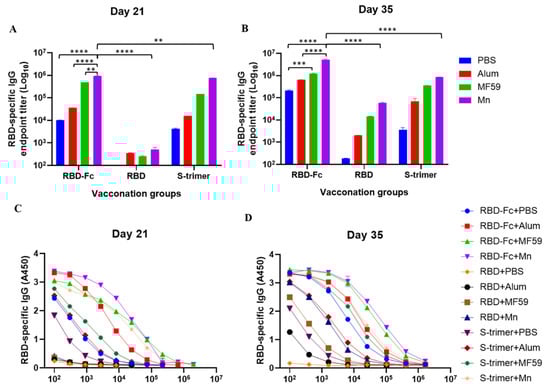 Mice were intramuscularly vaccinated with RBD-Fc, RBD or S-trimer plus alum, MF59 or nanoparticle manganese adjuvant three times at two-week intervals. RBD-Fc, RBD or S-trimer plus an equal volume of PBS were used as internal controls, and the sera were collected one week after each vaccination. The endpoint titers of IgG were detected with ELISA using RBD protein to coat the plates because the vaccinated mice with RBD-Fc antigen could produce anti-human Fc antibodies []. Based on sera collected from mice on day 21 (one week after the second vaccination), as shown in Figure 2A, a low level of immune response was observed in mice immunized with RBD. However, a slightly elevated antibody response was induced by RBD plus alum and MF59 adjuvants. The level of response was significantly increased in the group adjuvanted with nanoparticle manganese. A relatively higher level of immune response was observed in mice immunized with S-trimer, whereas, again, a slightly elevated antibody response was induced by S-trimer plus the three adjuvants. Compared with RBD and S-trimer, mice immunized with RBD-Fc exhibited a significantly higher level of immune response. Particularly elevated antibody responses were shown in the RBD-Fc groups adjuvanted with alum and MF59 adjuvants, respectively. Following the above trend, the RBD-Fc groups adjuvanted with nanoparticle manganese induced a significantly higher level when compared to the groups adjuvanted with alum and MF59. As shown in Figure 2B, the response in all groups reached a higher level on day 35 (one week after the third vaccination). Among the three adjuvants, nanoparticle manganese appeared to be the most potent in promoting RBD-specific antibody responses. We also tested the sera collected on days 21 and 35 for their capacities to bind to RBD protein. As shown in Figure 2C,D, the addition of adjuvants to RBD-Fc, RBD or S-trimer proteins improved their ability to bind to RBD protein, with, as noted above, RBD-Fc plus nanoparticle manganese being the most potent, followed by RBD-Fc plus MF59 as the second most potent, S-trimer plus nanoparticle manganese as the third most potent and RBD-Fc plus alum as the fourth most potent.