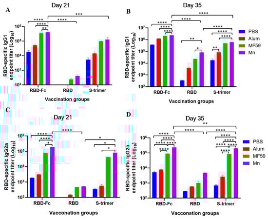 Titers of serum IgG1 and IgG2a antibodies to RBD protein in immunized mouse sera. RBD-specific IgG1 endpoint titer on day 21 (A) and on day 35 (B) in vaccinated mouse sera. RBD-specific IgG2a endpoint titer on day 21 (C) and on day 35 (D) in vaccinated mouse sera. Statistical significance was determined by two-way ANOVA and is indicated as follows: * p < 0.05, ** p < 0.01, *** p < 0.001, **** p < 0.0001. Error bars represent SD.