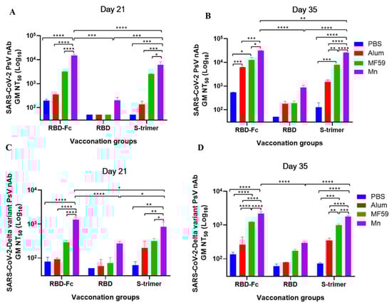 Neutralization activity observed in vaccinated mouse sera on days 21 and 35 against pseudotyped SARS-CoV-2 wildtype (D614G) and Delta variant. Mice immunized with different formulations were capable of producing neutralizing antibody responses to varying extents. Sera collected from mice on days 21 and 35 were evaluated for their content of neutralization antibodies. (A) nAbs against SARS-CoV-2 wildtype (D614G) pseudovirus by mouse sera collected on day 21. (B) nAbs against SARS-CoV-2 wildtype (D614G) pseudovirus by mouse sera collected on day 35. (C) nAbs against SARS-CoV-2 Delta variant pseudovirus by mouse sera collected on day 21. (D) nAbs against SARS-CoV-2 Delta variant pseudovirus by mouse sera collected on day 35. Statistical significance was determined by two-way ANOVA and is indicated as follows: * p < 0.05, ** p < 0.01, *** p < 0.001, **** p < 0.0001. Error bars represent SD.
