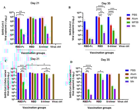 We further detected the antiviral effect of all immunized mouse sera collected on days 21 and 35 against the authentic SARS-CoV-2 wildtype (HKU-001a strain) and Delta variant by using VeroE6-TMPRSS2 cells. Compared with RBD and S-trimer, we found that RBD-Fc effectively reduced the viral load of the authentic SARS-CoV-2 wildtype and Delta variant in cell culture supernatants on day 21, and nanoparticle manganese was the most potent enhancer (Figure 5A,C). As shown in Figure 5B,D, the mouse sera collected on day 35 obviously reduced the viral load in the supernatants, and nanoparticle manganese was the most potent enhancer.