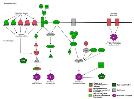 Summarized differentially methylated pathways in PI fetal spleens associated with bone development and osteoclast differentiation. Green = hypermethylated, predicted decreased expression; red = hypomethylated, predicted increased expression; gray = not differentially methylated or not identified in RRBS; white text: protein.