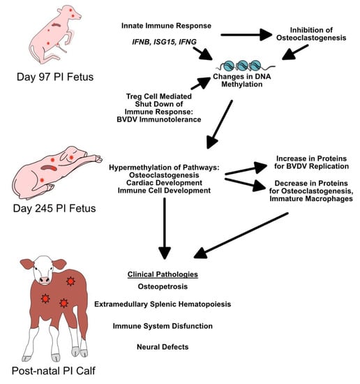 Methylation of genes and the impact on protein expression may help explain the pathologies in multiple organ systems associated with early BVDV transplacental infections. We suggest that the inflammation and cytokines associated with the early fetal response to BVDV infection, along with Treg suppression of the immune system during immunotolerance, inhibit proper osteoclastogenesis and bone formation (summarized in Figure 4). In earlier studies, our group found an upregulation of IFNB, IFNG, and ISG15 in day 97 PI fetuses (21 days post maternal infection) [,]. These IFNs and ISG15 are known inhibitors of osteoclastogenesis, and their expression of these IFNs early in fetal development may not only inhibit ongoing osteoclastogenesis, but also cause the inhibition of osteoclastogenesis through hypermethylation of genes in most pathways affecting bone development and immune cell development [,,]. By day 190 of gestation, Treg cells identified BVDV as self and suppressed the immune response to viral antigens; however, the epigenetic damage would have already been done. The results presented correlate with previously described pathologies observed in PI cattle postnatally, suggesting that the epigenetic changes caused by BVDV fetal infections have a large role in fetal development.