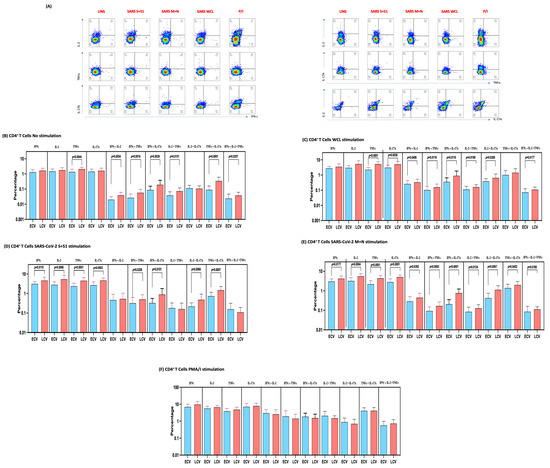 In total, 5–6 million PBMC cells were stimulated for 12 h with SARS-CoV-2 peptide pools and whole cell lysate in the presence of αCD28/αCD49d costimulatory antibodies (BD FastImmune; BD Biosciences, Franklin Lakes, NJ, USA). A negative control containing PBMCs and costimulatory antibodies (unstimulated condition) from the same subject and PMA/I stimulation as a positive control was also included for each assay. Following stimulation, cells were washed with PBS and surface stained for 30 min in the dark at 4 °C with viability reagent. The cells were then washed and permeabilized with BD Perm/Wash buffer (BD Biosciences) and stained with intracellular markers for an additional 60 min before washing and acquisition. Antibodies containing surface and intracellular markers are FITC-CD8 (SK1), APC R700-CD3 (UCHT1), BV510-CD4 (SK3), PE-CF594-CD56 (NCAM 16.2), BV421-IL2 (5344.111), APC-TNF-a (6401.1111), BV650-IL17A (N49-653), Per-CP-CD69 (L78), BV421-OX40 (CD252), APC-CD38 (HB7), PerCP-Cy5.5- Perforin (Do-G9), BV421-Granzyme-B (GB11), Fixable viability stain 780 (FVS780) from BD Biosciences, Franklin Lakes, NJ, USA, PerCP-Cy5.5-IFN-γ (4S.B3) from eBioscience-Invitrogen, San Diego, CA, USA and Alex-Fluor 647-Granulysin (DH2), BV650-CD107a (H4A3) from Biolegend, San Diego, CA, USA. Fourteen-color flow cytometry was performed on a FACS Cellesta flow cytometer with FACS Diva software v.7 (Becton Dickinson, Franklin Lakes, NJ, USA). The lymphocyte gating was set by forward and side scatter and at least ~100,000 lymphocytes events were acquired. Data were collected and analyzed using Flow Jo 10.7.1 software (TreeStar Inc., Ashland, CA, USA). Multifunctional T cell cytokines expression was calculated using the Boolean gating method. All data are depicted as frequency (percentage) of T cells expressing cytokine(s) and other immune markers.