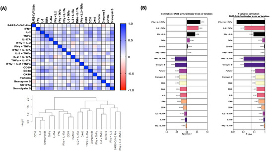 Relationship between Immune markers and SARS-CoV-2 antibodies. (A) Multiparametric matrix correlation plot of immune markers and SARS-CoV-2-specific antibodies in all individuals of early convalescent (ECV) COVID-19 (n = 20) and late convalescent (LCV) COVID-19 (n = 20). (B) Spearman’s correlation coefficients are visualized by color intensity. p values and Spearman r values are ordered by hierarchical clustering.