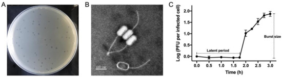 Twenty microliters of the desalted phage solution were spotted on carbon-coated copper grids (200 mesh). After 30 min of adsorption in the dark, the phage sample was negatively stained with 1% phosphotungstic acid for 1 min, followed by air drying for 10 min. Phage images were captured using a JEM-2100 transmission electron microscope (JEOL, Tokyo, Japan) at 80 kV. The size of phage particles was measured from at least five TEM images using ImageJ software [7].