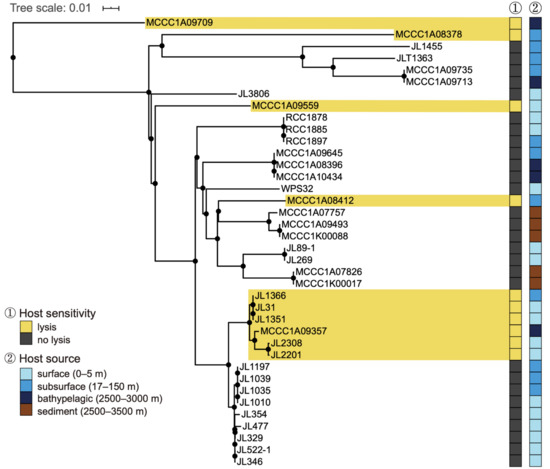 Intraspecific lysis profiles of phage RXM against 38 citromicrobial strains recovered from various seawater depths. Citromicrobial whole-genome phylogenic tree was built using progressive Mauve [28]. Sensitive strains are highlighted using yellow squares, and insensitive strains are highlighted with dark brown squares.