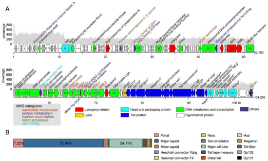 Genomic and proteomic features of phage RXM. (A) Full-genome map of RXM. Mean fold coverage at each position is shown using gray bars. The orientation of each predicted gene product corresponds to the direction of transcription. Genes within different functional categories are indicated by the colors noted below. Predicted phage AMGs are marked with different colors based on different functional categories displayed in the lower-left quadrant. Confirmed viral structural genes are marked with an asterisk (*). (B) Relative abundance of RXM structural proteins detected using LC-ESI-MS/MS.