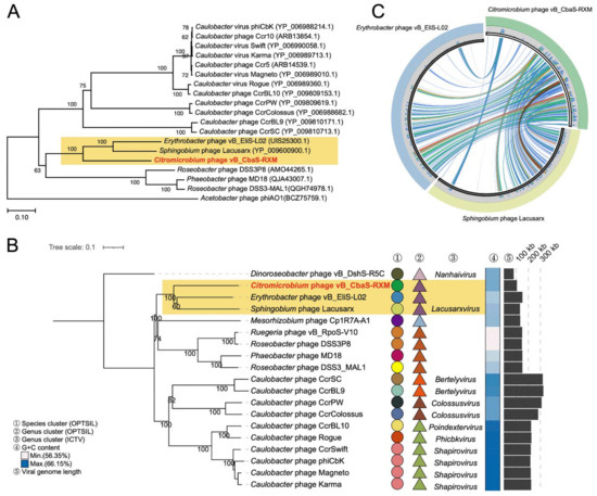 Citromicrobium bathyomarinum is a Gram-negative marine species in the family Sphingomonadaceae and the class Alphaproteobacteria. As it benefits from its good adaptability to dynamic environmental conditions [2], the species has been commonly found from various depths in seawater [3,4]. C. bathyomarinum is also an aerobic anoxygenic photoheterotroph that plays an important role in oceanic carbon cycling and energy flow [5]. Only by integrating information on phages targeting this species can we better understand how bacteriophages influence the ecology of citromicrobial photoheterotrophs. However, our current understanding of citromicrobial phages remains in its infancy. To date, only one ssDNA viral isolate infecting C. bathyomarinum RCC1878 has been reported [6], which is far behind the progress of other marine phages, such as phages infecting Vibrio, Roseobacter, and Cyanobacteria.