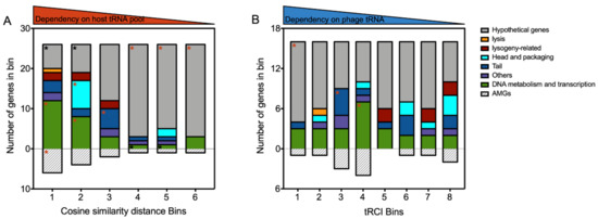 Phage gene contents in bins sorted by cosine similarity distance to host genome (A) and by tRCI values (B). Significant enrichment and underrepresentation (p < 0.05) of genes associated with specific functions are depicted with red and black asterisks (*), respectively.