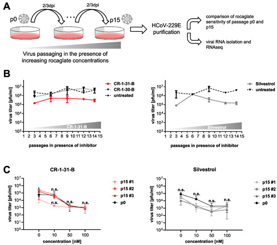 Passaging of HCoV-229E in the presence of increasing concentrations of rocaglates. (A) Schematic illustration of workflow. (B) MRC-5 cells were infected and treated as shown in (A) and titers were determined (n = 3). Here, one representative passaging experiment out of three is shown. (C) MRC-5 cells were infected with plaque-purified HCoV-229E from p0 (non-passaged) to p15 (serially passaged, obtained as shown in panel (B) at an MOI of 0.1 and treated for 24 h either at the indicated concentrations of CR-1-31-B or silvestrol or left untreated for the same time period. Viral titers were then determined using plaque assay (n = 3). Significance levels compared to p0 were obtained using the unpaired t-test and are indicated as follows: *: p < 0.05; n.s.: not significant. Error bars show SD.